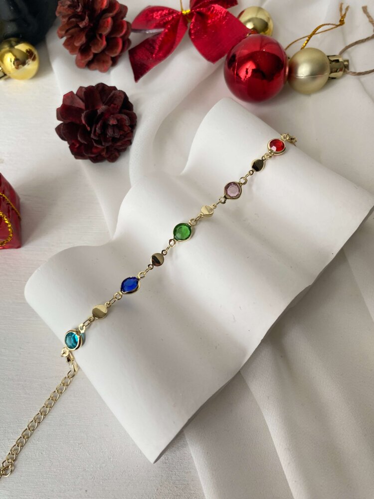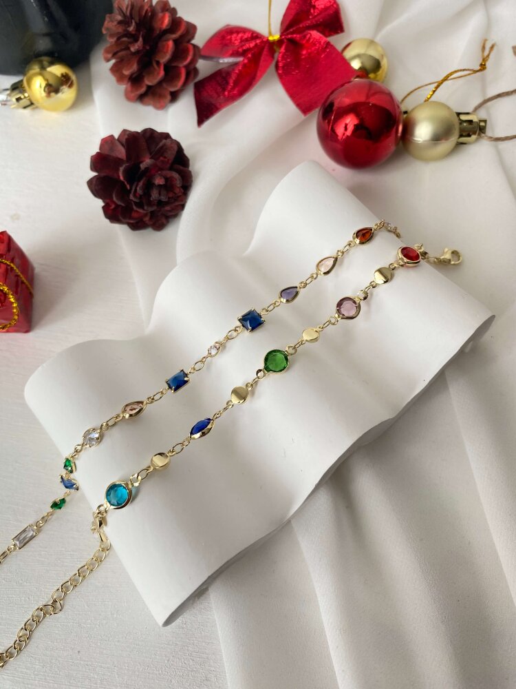 Çok Renkli Kare -Yuvarlak Taşlı Zincir Bileklik